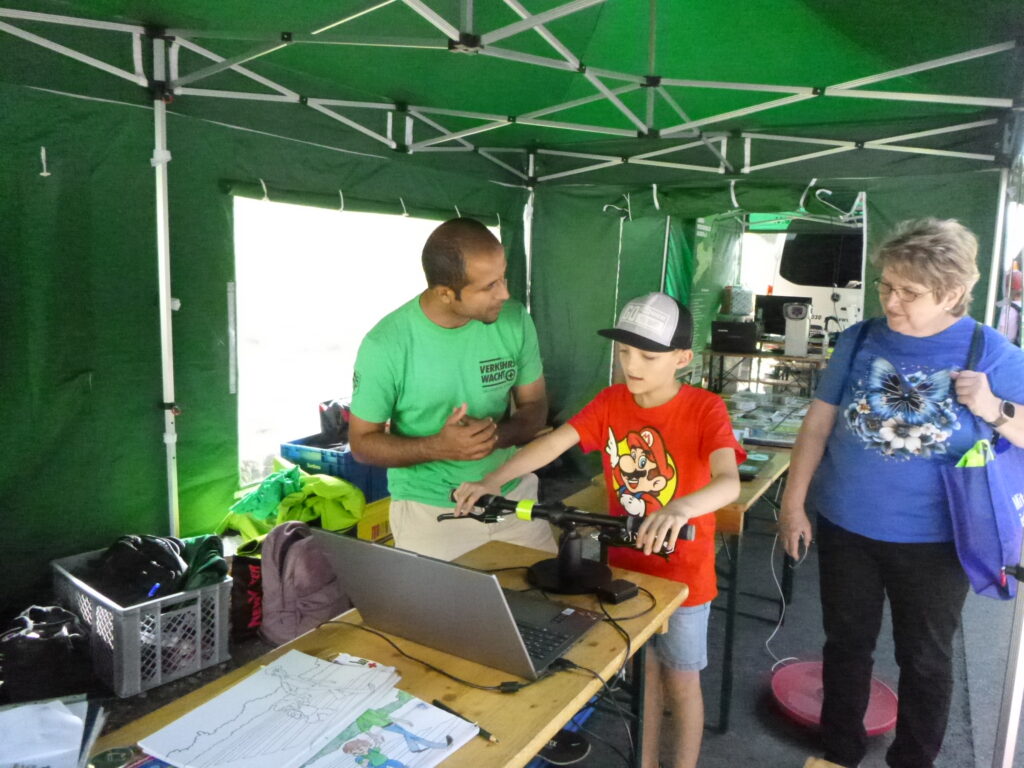 Die sächsische Verkehrswachtorganisation präsentierte sich gemeinsam mit der Polizei und vielen weiteren Vereinen auf der Blaulichtmeile. Verkehrswächterinnen und Verkehrswächter aus der Landesverkehrswacht Sachsen, der Verkehrswacht in Dresden und der Verkehrswacht in Pirna boten mit ihren Angeboten für Erwachsene und Mitmach-Aktionen für Kinder und Jugendliche ein interessantes Spektrum unserer Arbeit und interessante Gespräche rund um sichere Mobilität. Nicht nur Theorie, sondern vor allem hautnah erlebbare Verkehrssituationen an unseren Simulatoren wie z. B. Aufprall-Simulator, Seh-, Reaktionstests, VR-Brillen lösten vielfach Erstaunen und AHA-Effekte aus. Davon überzeugte sich auch der Präsident des Sächsischen Landtages, Alexander Dierks, bei seinem Besuch am Stand gemeinsam mit unserem Präsidenten Andreas Nowak MdL.